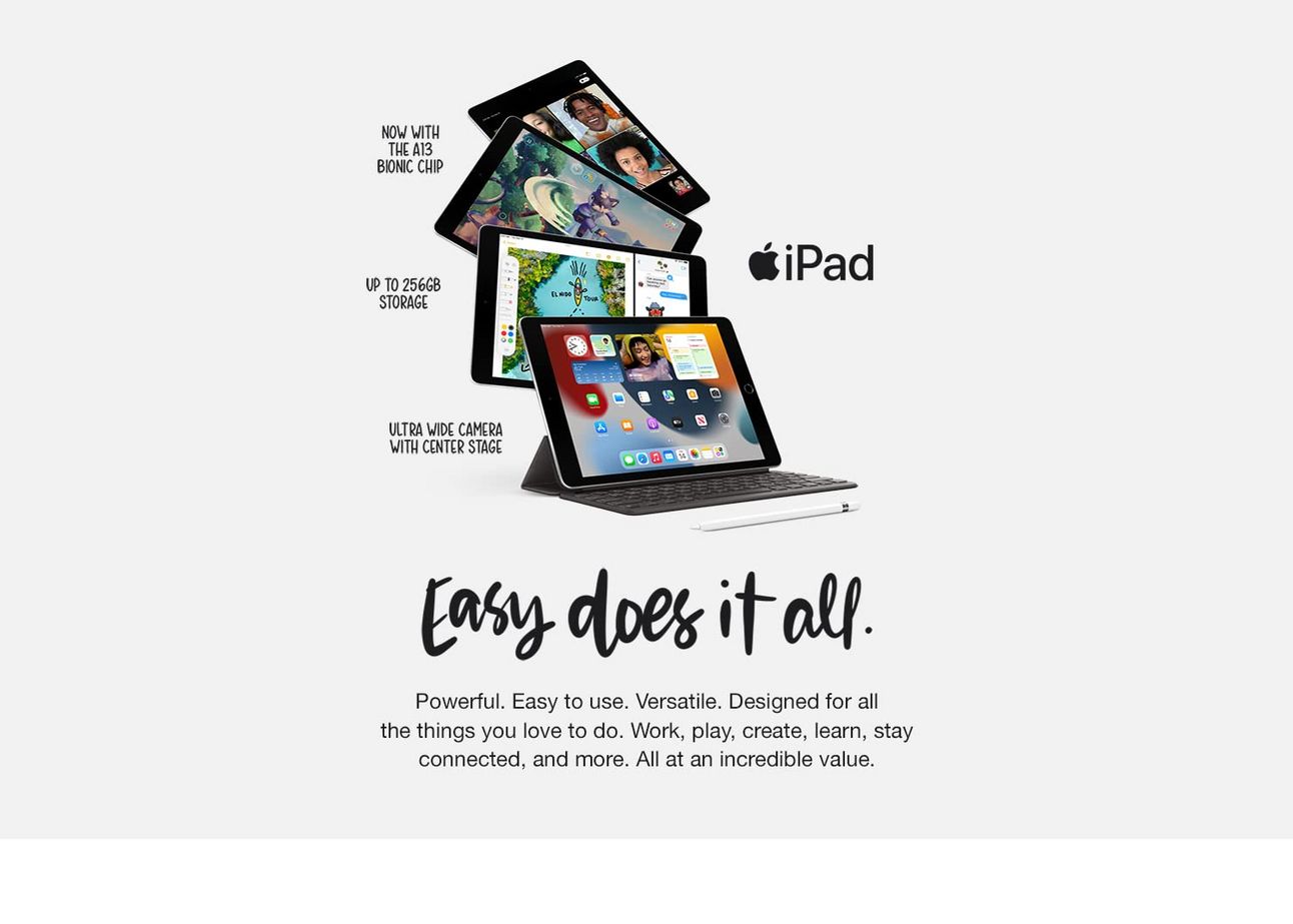 All the essentials in the most affordable iPad, with a beautiful 10.2-inch Retina display, powerful A13 Bionic chip, and an Ultra Wide front camera with Center Stage. Work, play, create, learn, stay connected, and more.